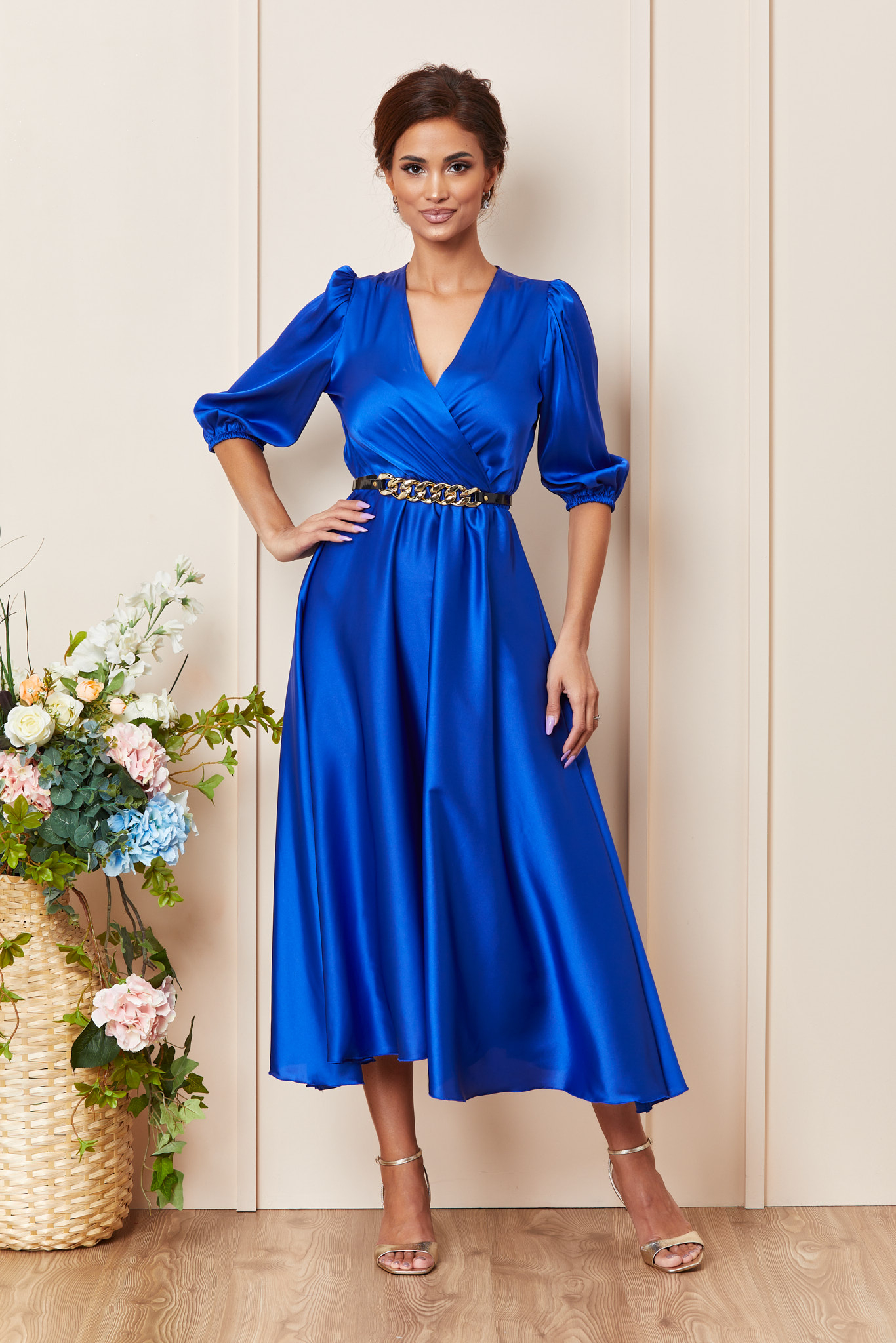 Rochie midi albastra, aspect petrecut in partea de sus si maneci trei sferturi perfecta pentru foarte multe ocazii. Este o combinatie de clasic si modern perfecta atat pentru tinute office, tinute formale dar si elegante. material neeelastic decolteu in V petrecut fara jupon fara fermoar maneci trei sferturi cu elastic Dimensiuni disponibile: S, M, L