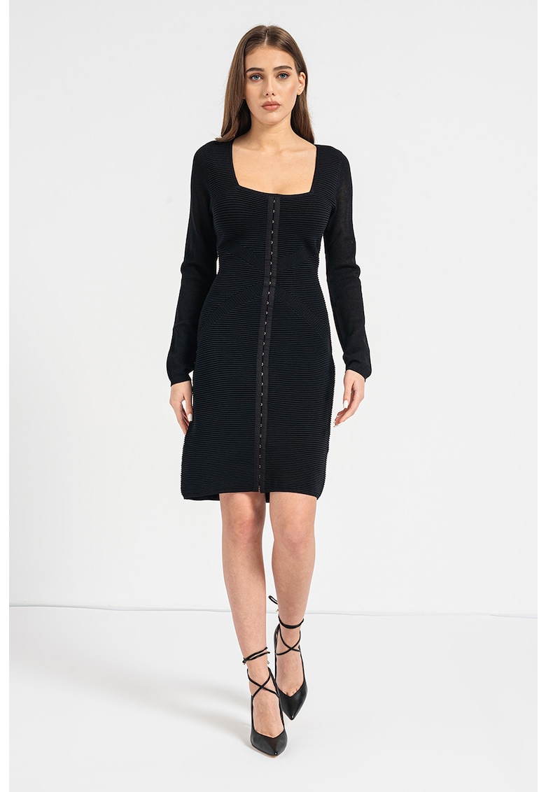 Caracteristici Culoare: negru Stil: casual Material: sintetic Imprimeu: uni Croiala: cambrata Lungime: midi Guler: ascutit Lungime maneca: maneca lunga Detalii: decupaje - aspect striat Sistem inchidere: nasturi Compozitie Exterior: 65% triacetat - 35% poliamida